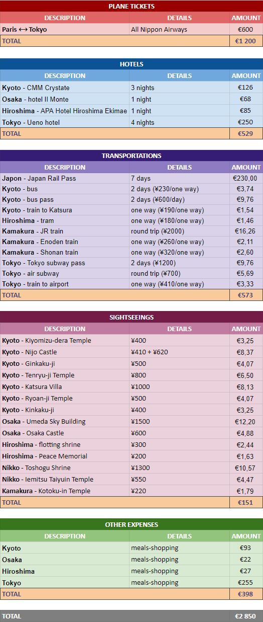 This is just an example of expenses that can totally be adapted to the trip you are actually planning. You can adjust the expenses according to the choices you make in terms of accomodation, restaurants, activities, additional stops … And be aware that these expenses apply to a 10-day trip for 2 people.
