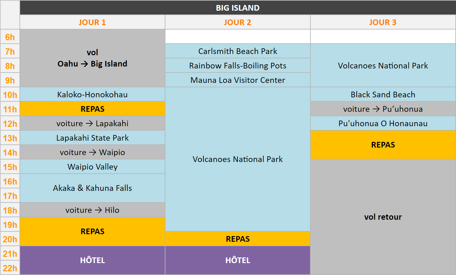 Pour visiter cette grande île qu’est Big Island, il est nécessaire de réserver des hôtels à chacunes des différentes étapes, contrairement à Kauai et Oahu, où il était possible de ne réserver qu’un seul et même hôtel pour toute la durée du séjour, car les distances sont vraiment rallongées. Donc à minima, il faut réserver un hôtel à Hilo, et un autre au Volcanoes National Park. Et même un à Kona, si vous souhaitez approfondir la visite de la région.