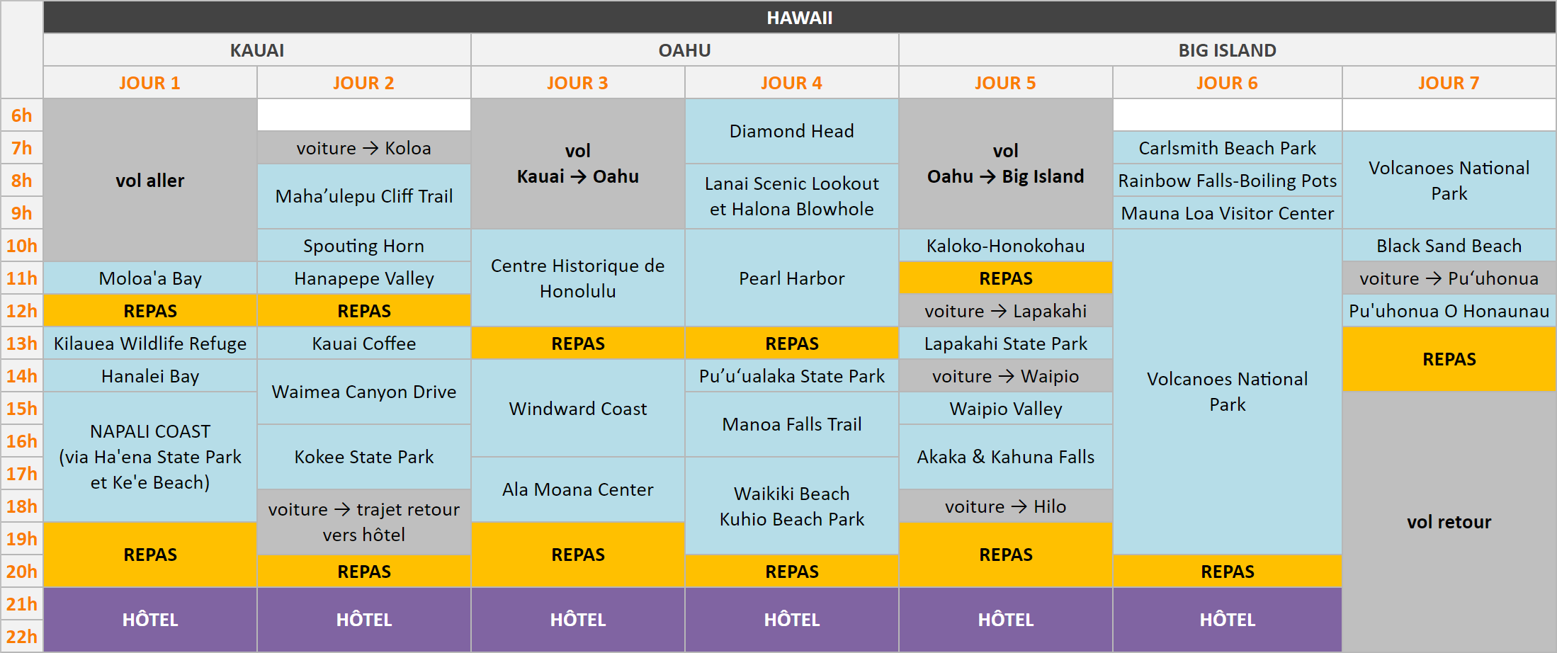 Hawaii c’est 4 îles principales : Kauai, Oahu, Maui et Big Island. Ensuite, il y a 2 petites îles, mais qui se visitent plutôt depuis Maui : Lanai et Molokai. Enfin, il reste 2 autres îles, mais qui ne se visitent pas vraiment. Lors de mon voyage, je n’ai visité que 3 des 4 principales îles. Je garde Maui, Lanai et Molokai pour un autre séjour. Ceci dit, vous pourriez très bien faire un seul gros voyage et parcourir les 6 îles d’un seul coup !
