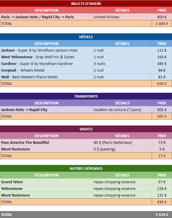 Vous voulez avoir une idée du budget pour un séjour à destination de deux endroits mythiques aux Etats-Unis : Yellowstone et le mont Rushmore ? Venez jeter un œil aux dépenses que j’ai faites lors de mon voyage.