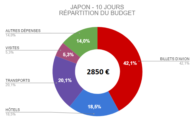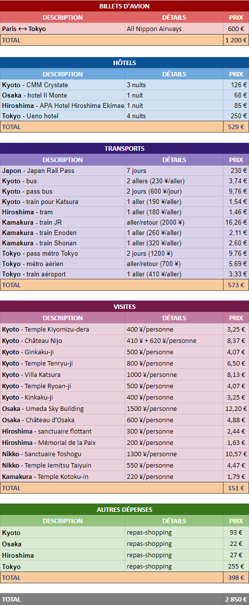 Ceci n’est qu’un exemple de dépenses que vous pourriez faire, et que vous pouvez totalement adapter au voyage que vous êtes en train de planifier. Vous pouvez parfaitement moduler les dépenses, en fonction du choix d’hôtels, de restaurants, d’activités, d’étapes supplémentaires… Et je précise que ces dépenses valent pour un voyage de 10 jours pour 2 personnes.