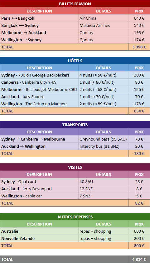 Concrètement le budget est totalement modulable et dépendra beaucoup de vos envies. Ceci est donc simplement un exemple des dépenses que vous pourriez faire, et que vous pouvez adapter au voyage que vous êtes en train de planifier.