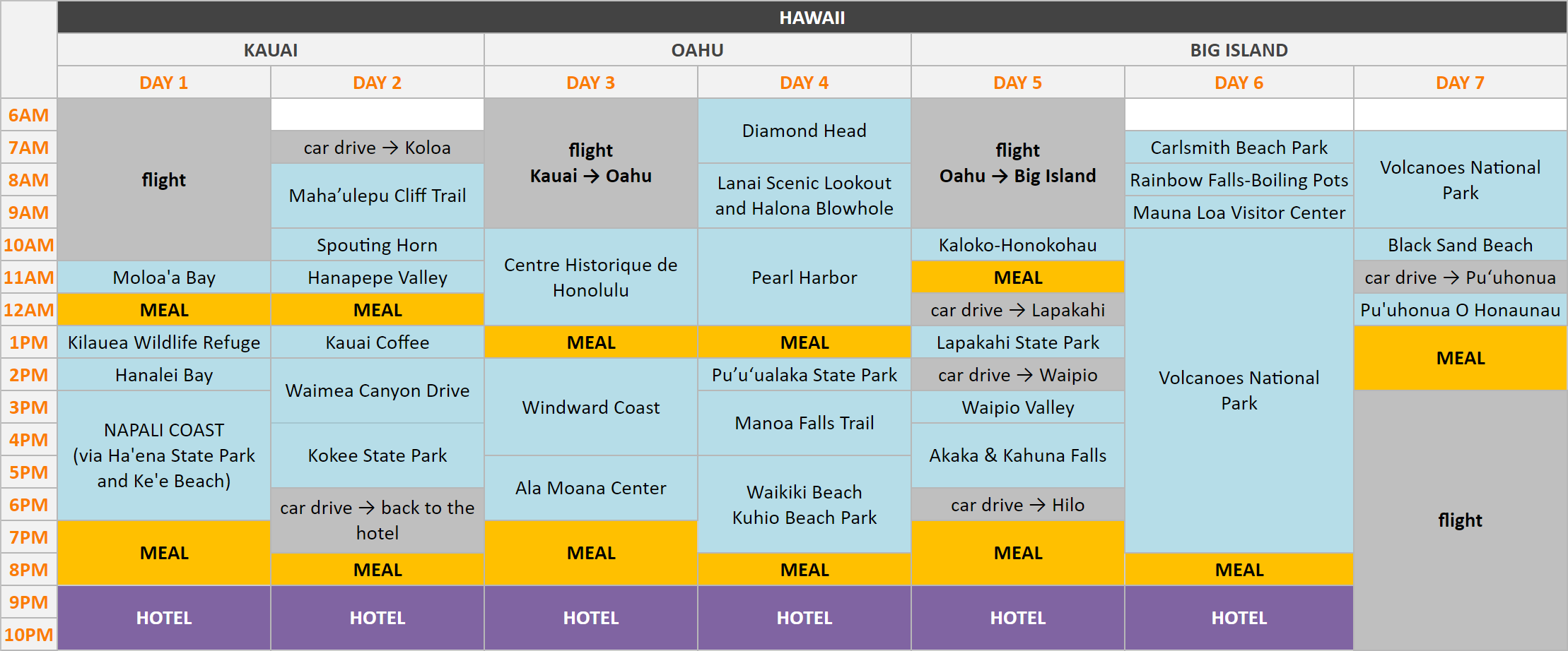 To get started, take a flight to go to the island of Kauai! When arriving at Lihue Airport, go to pick up the rental car you have previously booked, and you’ll then be ready to explore the island for two days. Then, it’ll be time to take a flight to go to Oahu (Daniel K. Inouye International Airport), and go to pick up your rental car in order to explore the island for another two days. And finally, take a flight that will bring you to Big Island (Kona International Airport), where you can go around the island in three days.