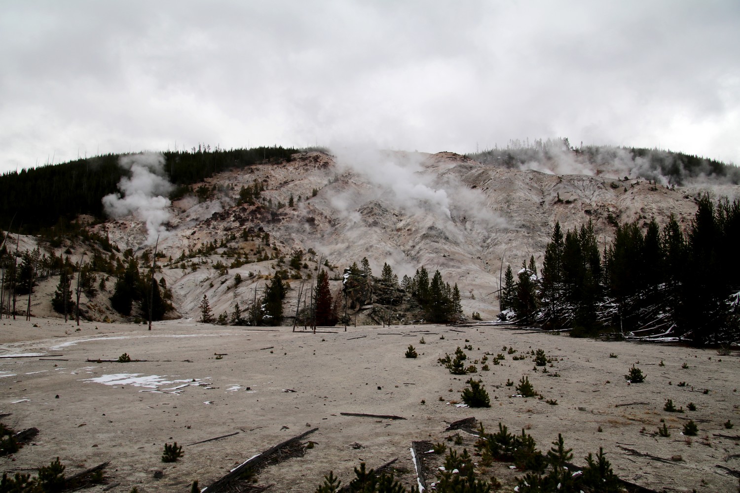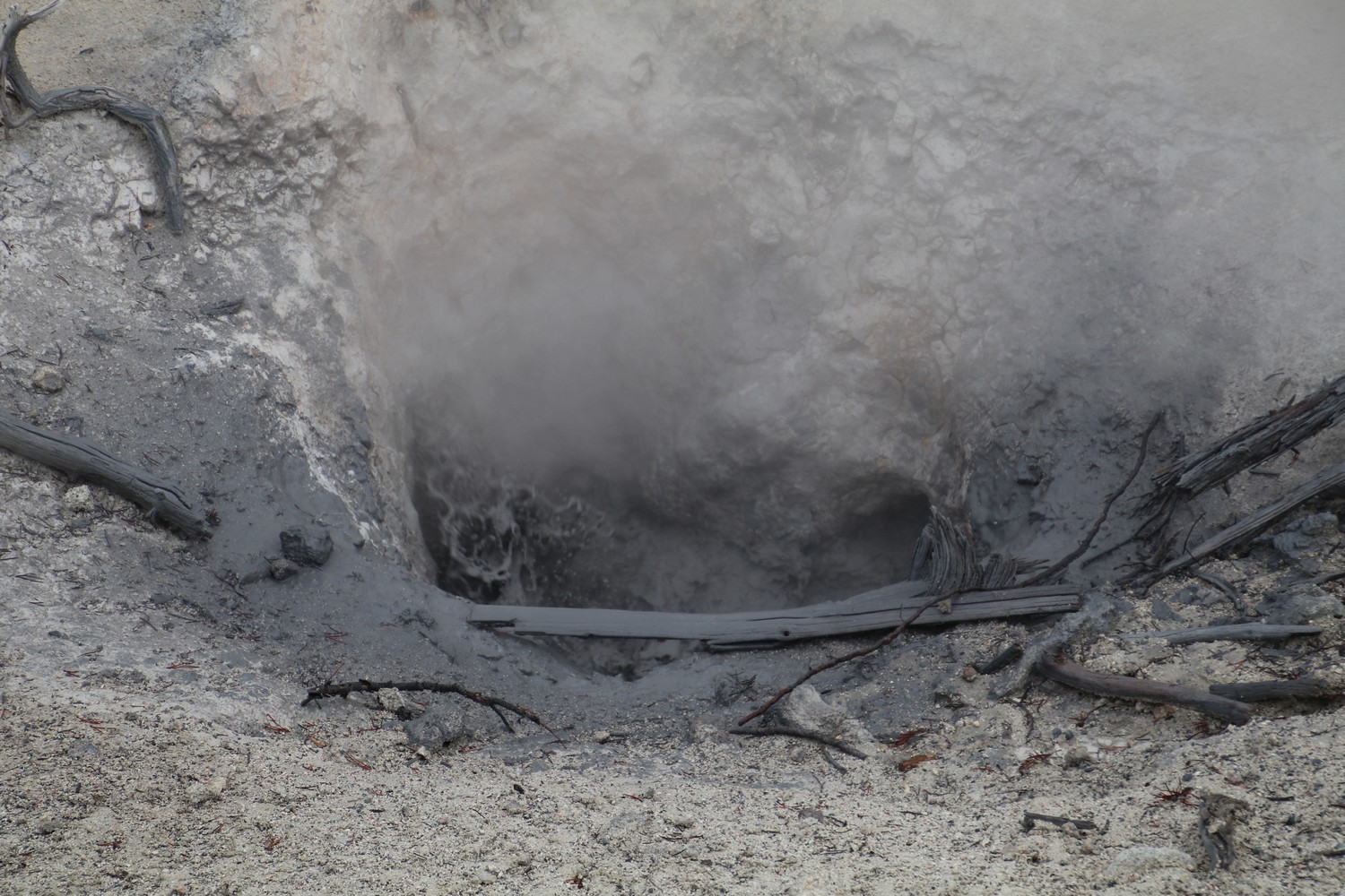The Mud Volcano area is located a bit before arriving at Lake Village and is reachable via the Grand Loop Road. A small loop path passes through geysers and mudpots.